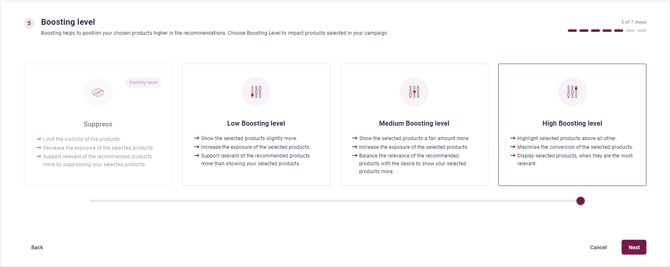 Choose the Boosting level to define how much attention your chosen products will get in the defined modules. A high boosting level will almost almost place the selected products in the top, whereas medium and low levels will leave more room for the personalization logic defined by the algorithms behind the recommendation modules.