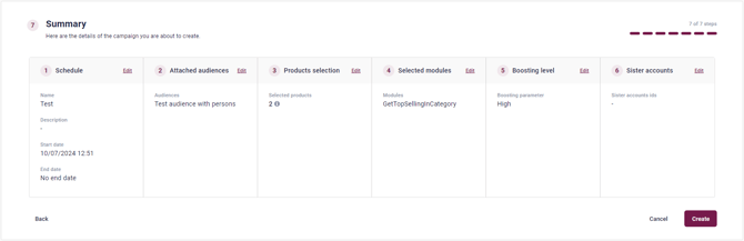 The last step provides you with a complete overview of all your choices during the Boosted Campaign creation-process.